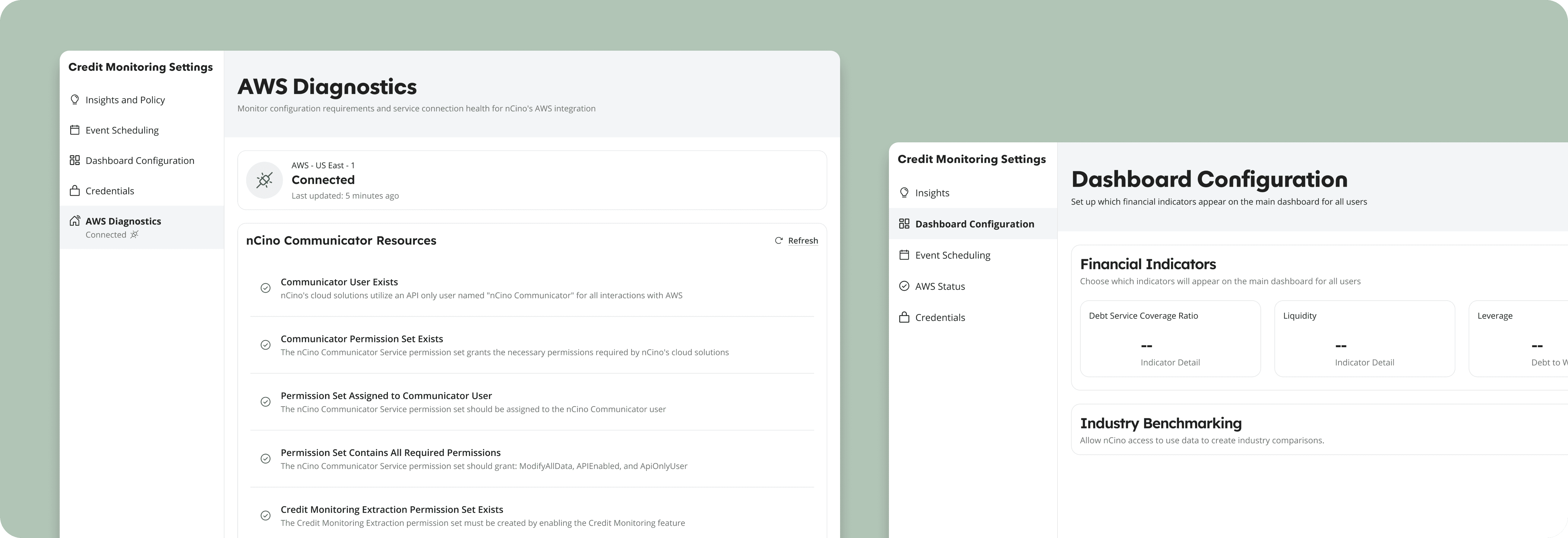 Admins live in connection states. A consistent status indicator shows the health of critical AWS connections, while a dedicated system status page provides deeper visibility into secondary connections and clear steps to resolve failures.