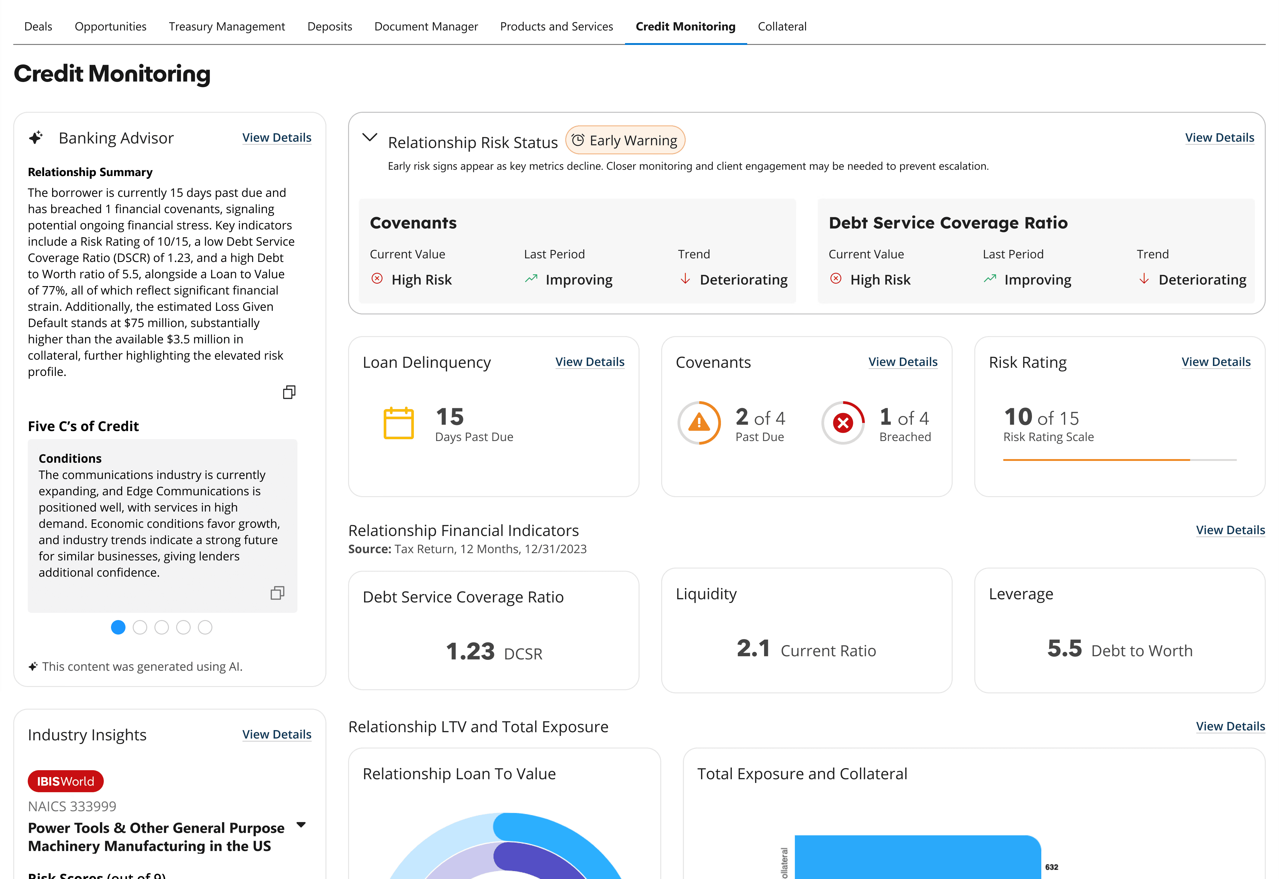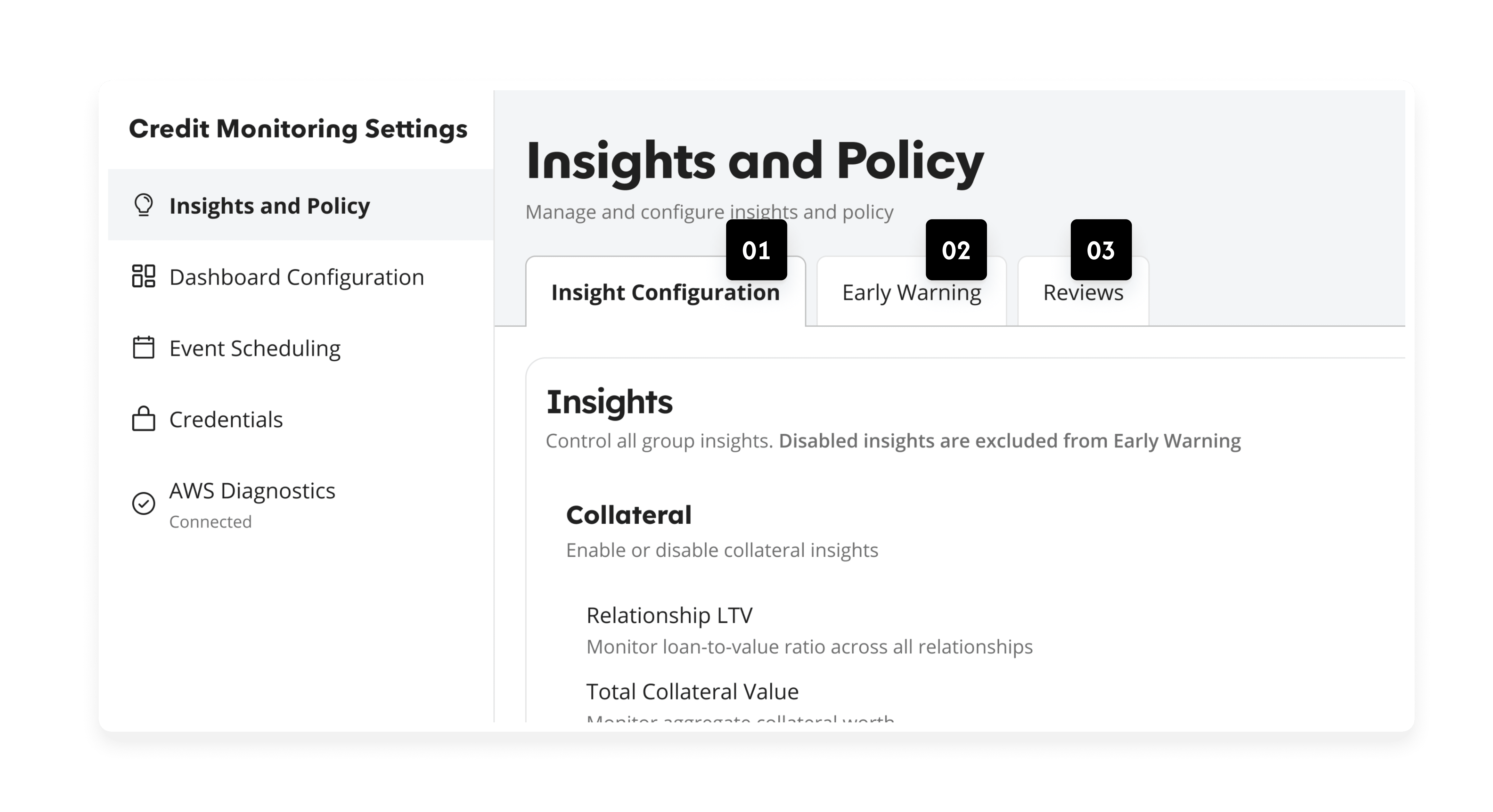 Banks need a single place to define risk thresholds, early warnings, and insights. Bringing these together makes it clear how the system evaluates and flags credit risk.